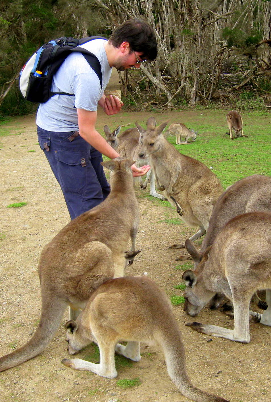 Determined to see the famous penguins on the beach, we also spent a day on Phillip Island. A 90 minute drive out of the city and linked by road to the mainland, the island is a popular holiday destination for Australians, with beaches, walking trails, surfing, a wildlife park, visitor centre, and the all-important birds. We’d not read anything about the park in advance and it turned out to be really good fun. Tons of indigenous animals – red kangeroos, wombats, tasmanian devils, kookaburra, emu, wallabies, cassowaries, dingos – are to be found, many of which roam freely and are happy to be fed by the hand. At one point, Paul found himself surrounded by eight kangaroos vying for his attention – and they are pretty darn big and powerful up close! We also took a stroll along the boardwalks around Swan Lake, spying unusual breeds of bird, and wandered around the coves spotting seals offshore. The main attraction, though, is the foundation set up to protect the island’s colony of 30,000 little penguins. As the sun began to set, we drove to the headland for a prime spot on the beach and watched as hundreds of them popped out of the sea, waddled across the sand, and made their way up the cliffs to their burrows. Very sweet; I just wish there’d been fewer people. Damn those tourists! Tsk.